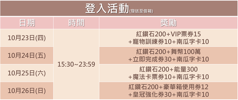 2025-10-23 (四)~2025-10-26(日),天天登入送獎勵。