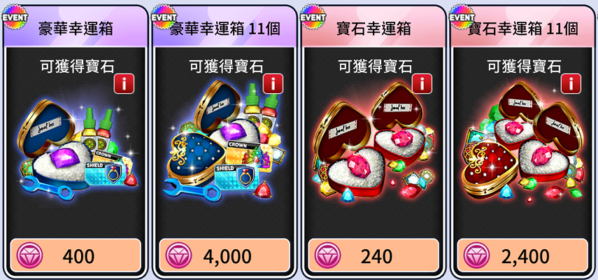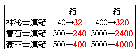 活動期間內,豪華/寶石/神秘幸運箱,獲得獎勵數量提升20%。