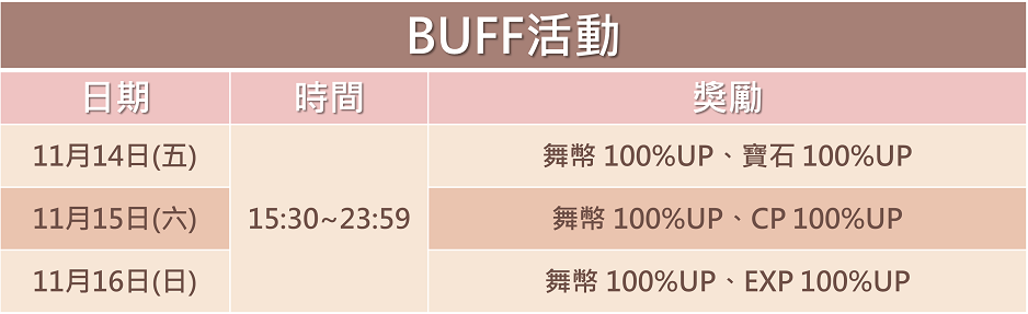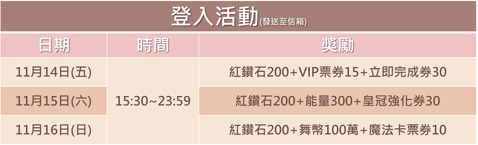 2025-11-14 (五)~2025-11-16(日),天天登入送獎勵。