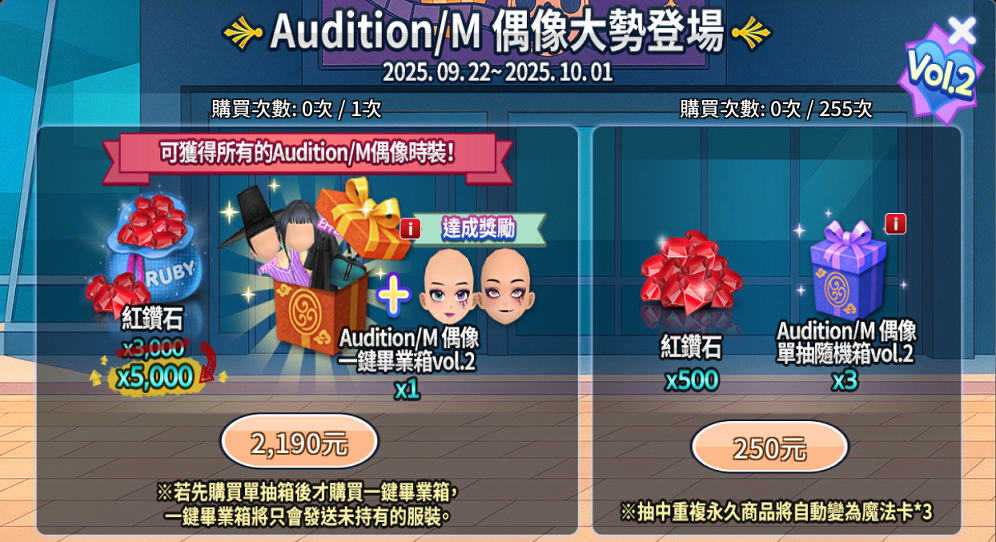 ※購買單抽箱時,抽中重複永久商品將自動轉換為魔法卡*3。