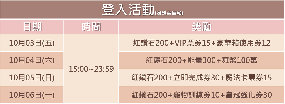 2025-10-03 (五)~2025-10-06(一),天天登入送獎勵。