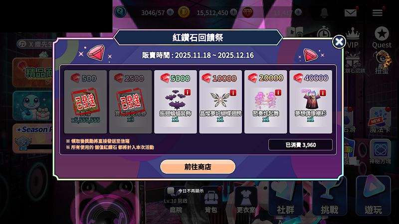 11月18日(二)~12/16(二)8:00,凡消費儲值紅鑽石達指定金額,即可獲得豐富補給及限定時裝!
