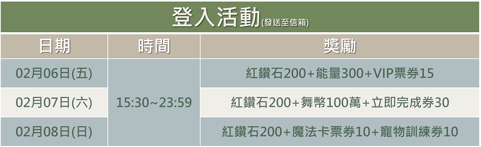 2026-02-06 (五)~2025-02-08(日),天天登入送獎勵。
