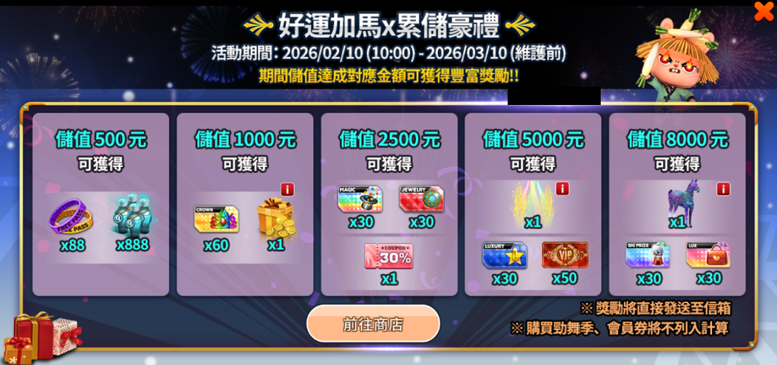 ꕤ儲值滿1,000元可獲得:皇冠強化券x60、千萬舞幣幸運箱x1