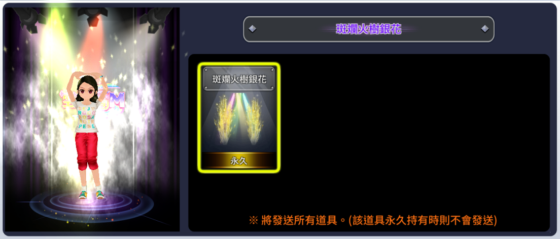 ꕤ儲值滿5,000元可獲得:斑斕火樹銀花(永久特效)x1、豪華箱使用券x30、VIP票券x50