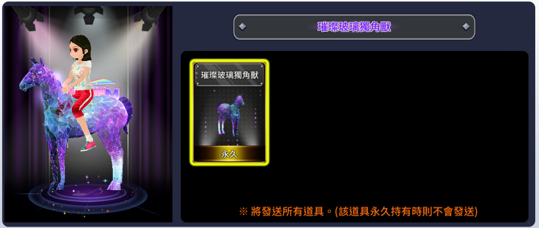 ꕤ儲值滿8,000元可獲得:璀璨玻璃獨角獸(永久S坐騎)x1、扭蛋券x30、名品券x30