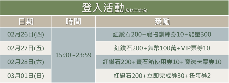 2026-02-26 (四)~2026-03-01(日),天天登入送獎勵。