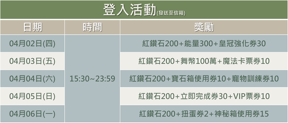 2026-04-02 (四)~2026-04-06(一),天天登入送獎勵。