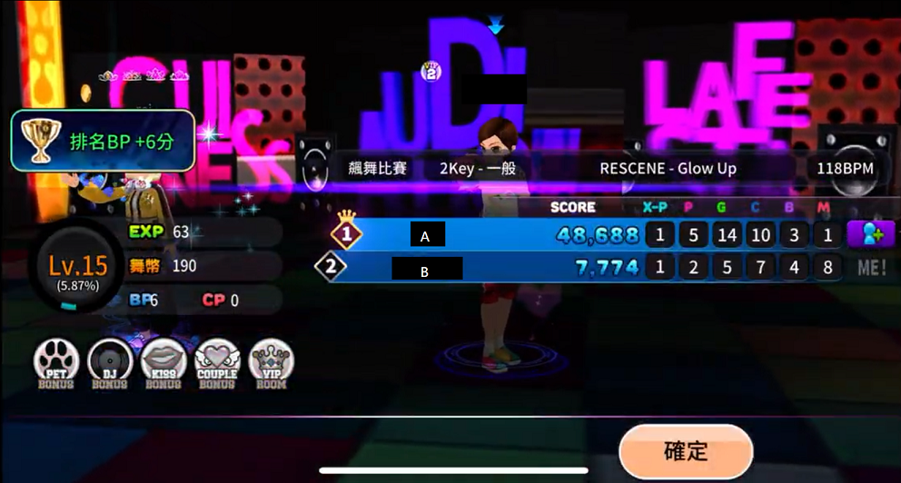 B遊玩的房間共2人(數值1.5),難度為個人戰2key一般(數值3),最後獲得第2名(數值2)