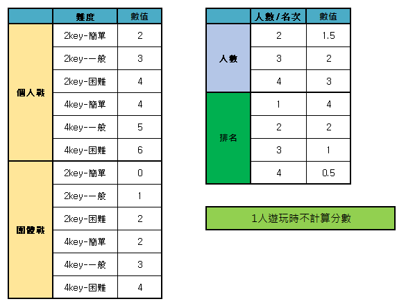 積分計算方式:人數數值x名次數值+難度數值=最終積分(四捨五入)