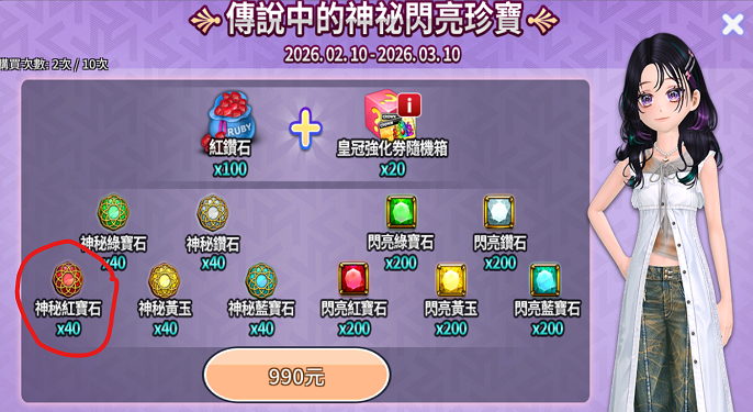 └2月改版後販售之「傳說中的神祕閃亮珍寶」禮包,其中的「神祕紅寶石x40」未派發。