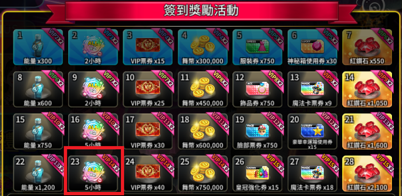 每日簽到23號獎勵「綜合加倍券5小時」,經確認後發現實際發放之獎勵為「綜合加倍券2小時」。